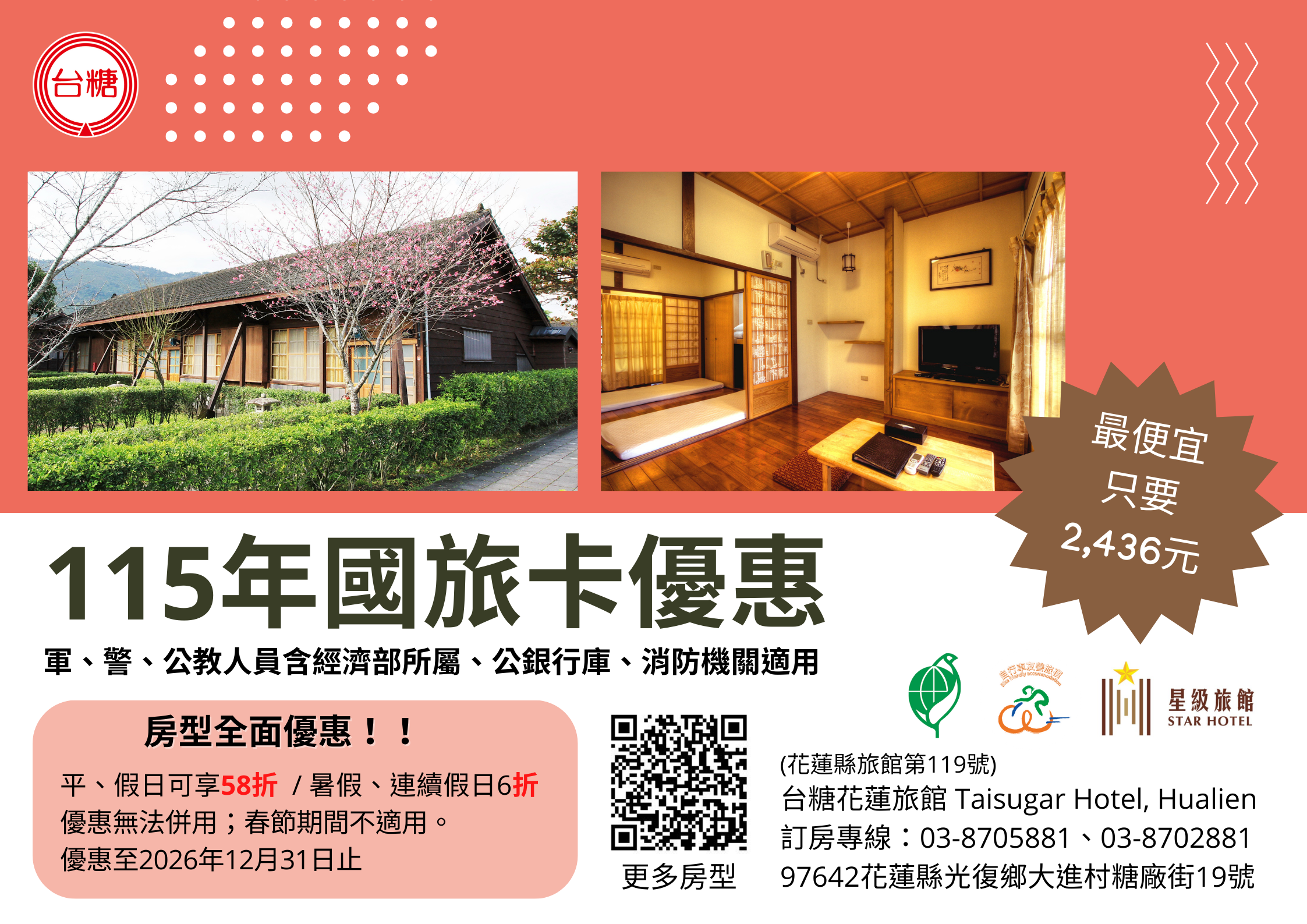 115年台糖花蓮旅館優惠軍、警、公教人員(含經濟部所屬國營事業、公營行庫、消防機關等適用)住宿及購物方案