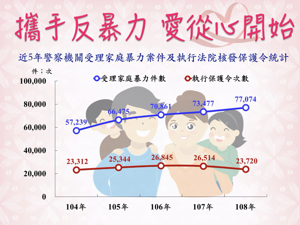 近5年警察機關受理家庭暴力案件件數自104年5萬7,239件逐年上升至108年7萬74件,增幅為34.65%;另警察機關執行法院核發之保護令次數,由104年2萬3,312次逐年遞增至107年2萬6,514次,108年減少為2萬3,720次。家庭暴力案件常由家庭經濟狀況、酗酒及子女管教等因素所引發,必須強化社政、?政、司法、教育和警政等網絡成員,共同協力落實各種婦幼保護政策與措施,以確保婦幼人身安全。