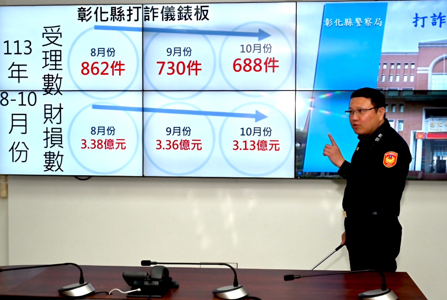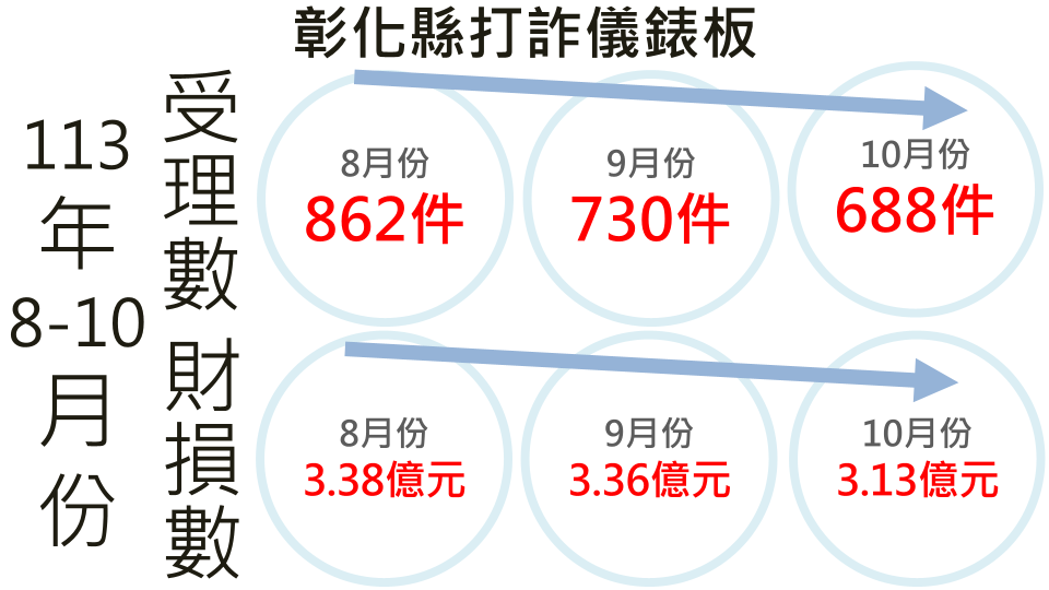 彰化縣警察局今日由局長陳明君親自主持記者會,透過打詐儀錶板,說明113年10月份彰化縣轄內詐騙現況,共受理詐欺案件688件,財損金額達新臺幣(以下同)3.13億元,相較8、9月份雖已連續2個月呈下降趨勢,但10月份平均每日遭騙金額仍高達1千萬元,其中投資詐騙案件占了總財損的73.62%,是最主要的詐騙類型,呼籲縣民不可不防。