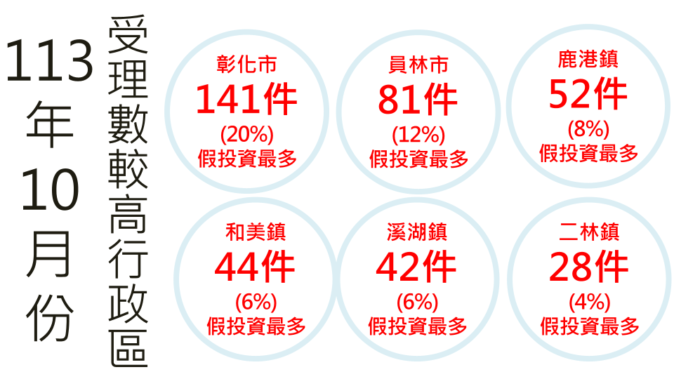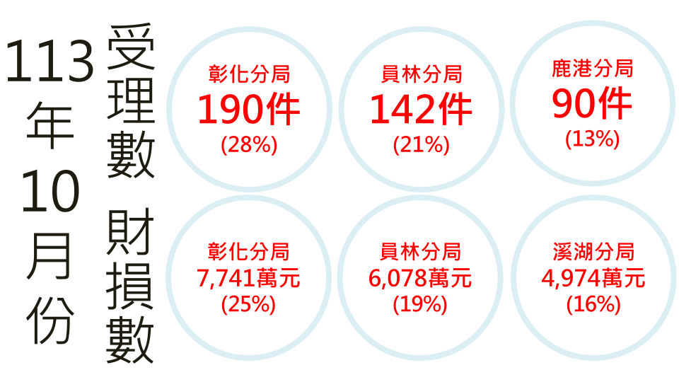 彰化縣10月份受理數最多的3個分局,多屬人口數稠密分局,依序為彰化分局(190件)、員林分局(142件)、鹿港分局(90件);財損金額最多3個分局,依序為彰化分局(7,741萬元)、員林分局(6,078萬元)、溪湖分局(4,974萬元)。依行政區統計,受理件數最多的3個行政區,依序為彰化市(141件)、員林市(81件)、鹿港鎮(52件);財損金額最多依序為彰化市(5,993萬元)、溪湖鎮(4,717萬元)、員林市(4,075萬元)。提醒上述區域民眾,仍應留意詐騙資訊。