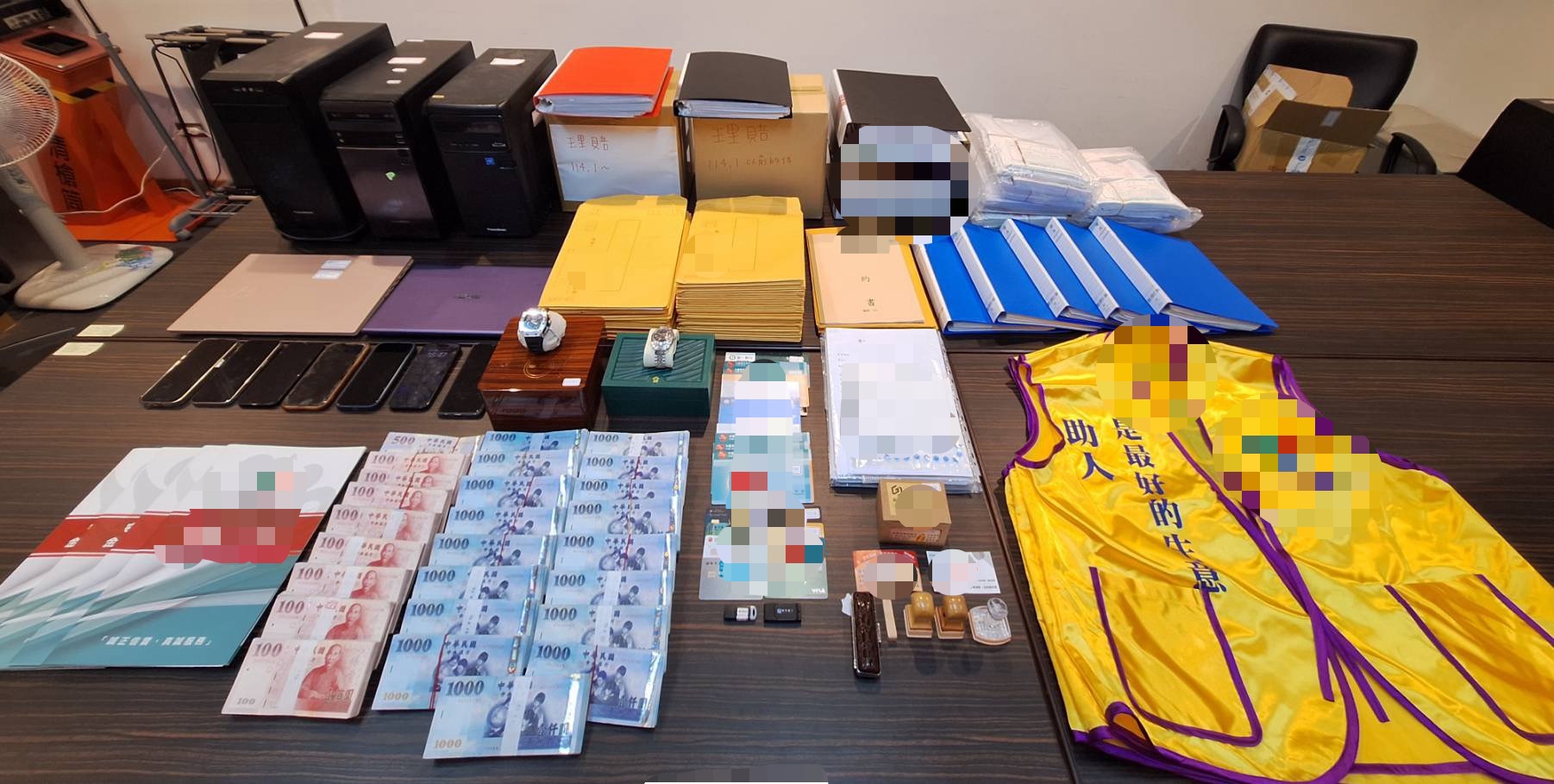 金○○公司各類書冊、契約、表單及文件資料76份/批【收支財報表、會員資料、統一發票暨會計憑證、金○○安心專案要助書、理賠申請書、客戶保險契約書、股東名冊、消費爭議會議資料、業務實戰SOP(教戰手冊)、業務制度表、宣傳單、名片、續繳承諾書、借據及收據、具結簽領解約紓困互助金和解書、解除契約申請書、帳冊、收款明細表、履約後援會名冊、理賠解約名單、共識研討會簽到簿等】、手機11支、電腦(含筆電、主機)4臺、存摺17本、金融卡7張、隨身碟2個、匯款單、印章5顆、名錶2支、現金新臺幣(下同)220萬8,308元等證物,並經新北地檢署凍結犯嫌及公司名下帳戶內937萬2,984元、美金33.62元及日幣85萬5元。另聲請扣押裁定獲准,扣押土地3處、有價證卷242萬9,440元、BMW汽車1部(換算全案查扣共計2,243萬2,854元)。