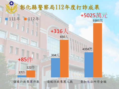 彰化縣警察局統計112年度,7次打詐專案共查獲詐欺集團122件650人,查扣不法所得價值總計新臺幣9,383萬餘元,比去年增加85件316人,整體查緝成果近年來最佳,有效維護選前治安,近年詐欺案件層出不窮,詐欺手法不斷翻新,造成受害民眾極大的財產損失和心理創傷,該局將打擊詐欺列為治安重點工作, 112年打詐成果不論件數、人數均較111年增加,打詐能量深獲民眾肯定。