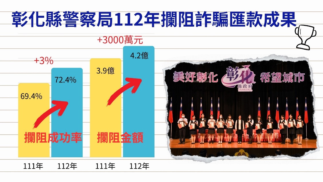 該局結合轄內金融機構,112年攔阻詐騙匯款949件,攔阻金額達新臺幣4億2,227萬3,313元,攔阻金額較111年成長3,000萬元,另透過各項防詐宣導作為,有效守護民眾荷包,獲得行政院112年「新世代打擊詐欺策略行動綱領研討會」識詐楷模獎項肯定。