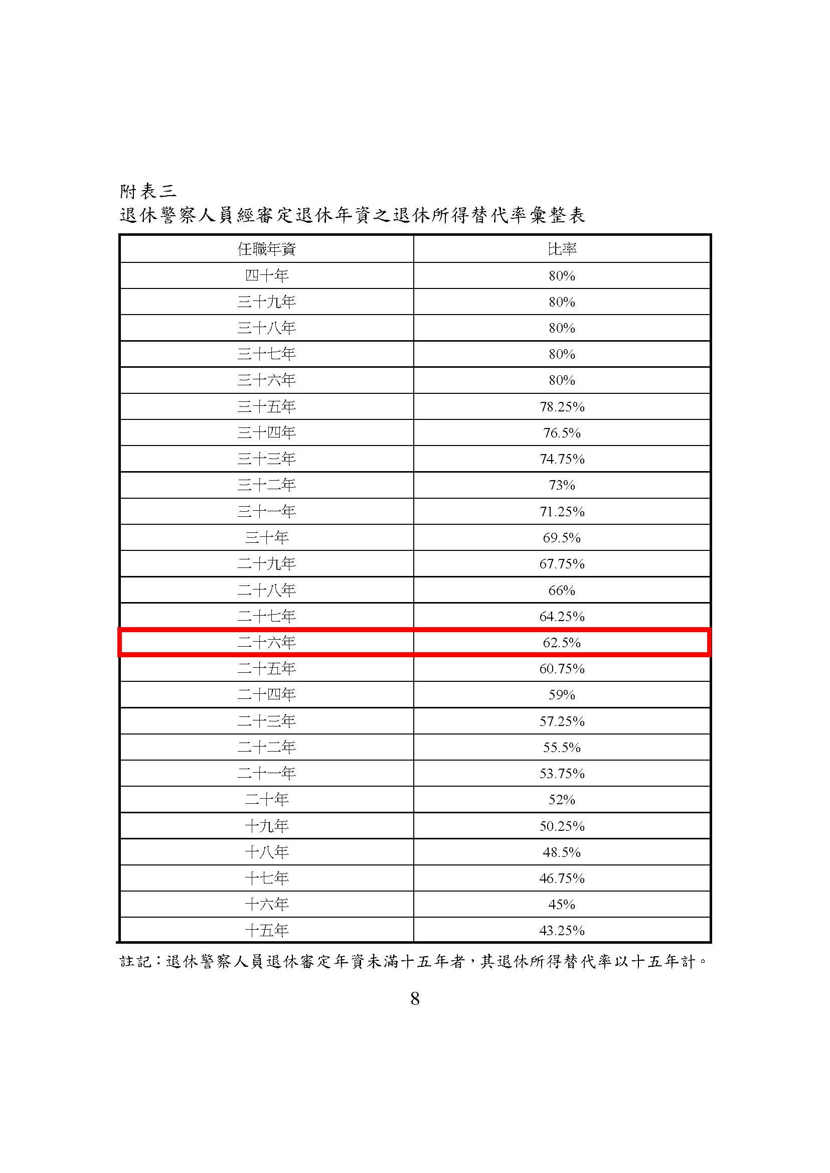 有關網載「銓敘部審定退休警察人員年資26年之退休所得替代率為62.5%有所錯誤,應為65%才正確」等情,查依114年4月27日生效之警察人員人事條例第35條及附表3規定,任職年資26年之退休所得替代率為62.5%,銓敘部依前開規定審定62.5%為正確內容,非網路誤傳之65%。